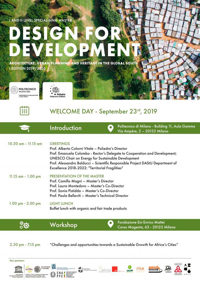 The first edition of the Master DESIGN FOR DEVELOPMENT. Architecture, Urban Planning and Heritage in the Global South started last Monday. The Master aims to improve professional skills to face the challenges of inclusive, sustainable urban development, with particular reference to the regions of the Global South and to countries with emerging economies. The Welcome day was opened by: